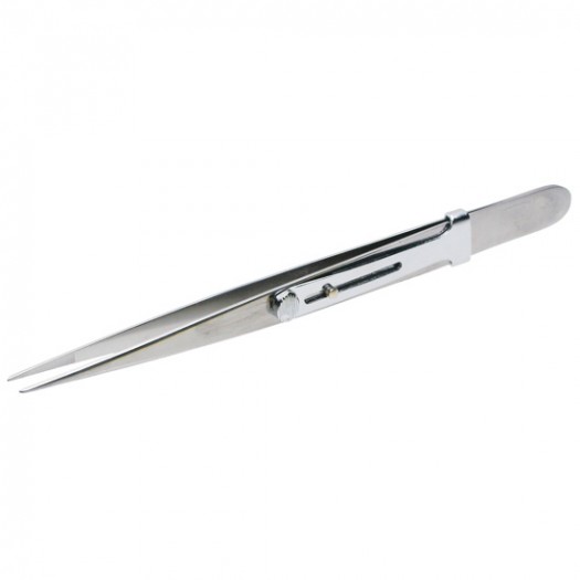 Chromium plated steel tweezers with slide lock.